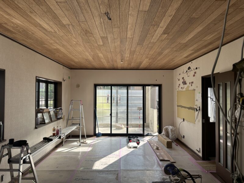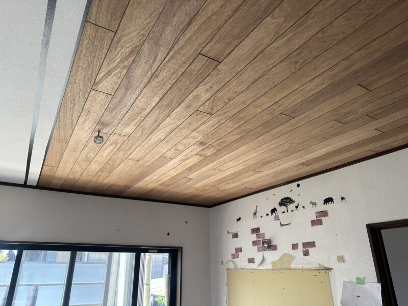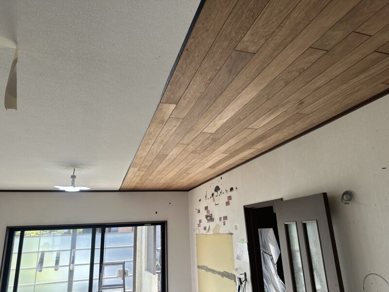 昨日は天井に化粧材を2人3脚で貼り付けていました。
