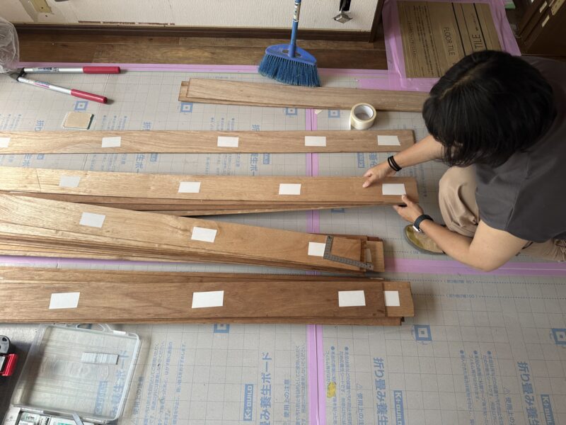11センチ× 1メーター82センチの合板を1枚1枚丁寧に貼って行きます。